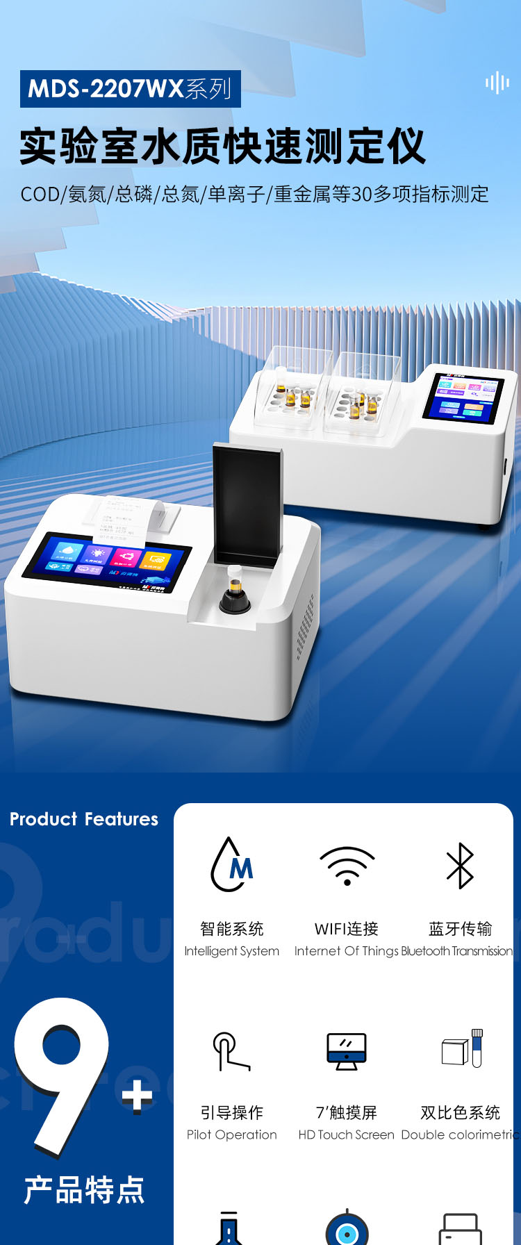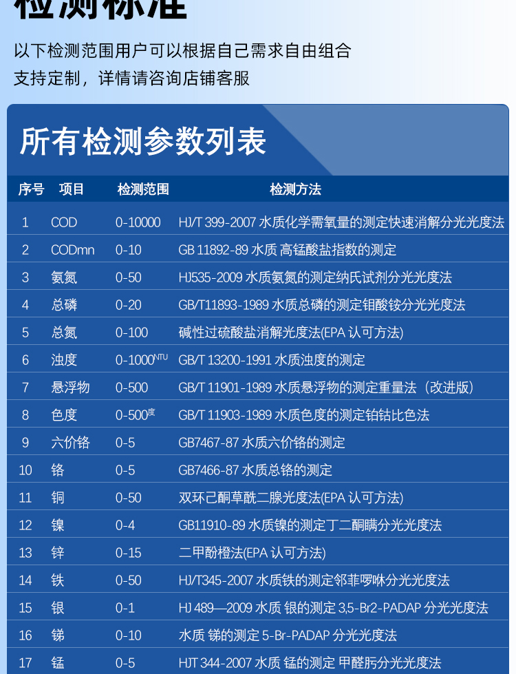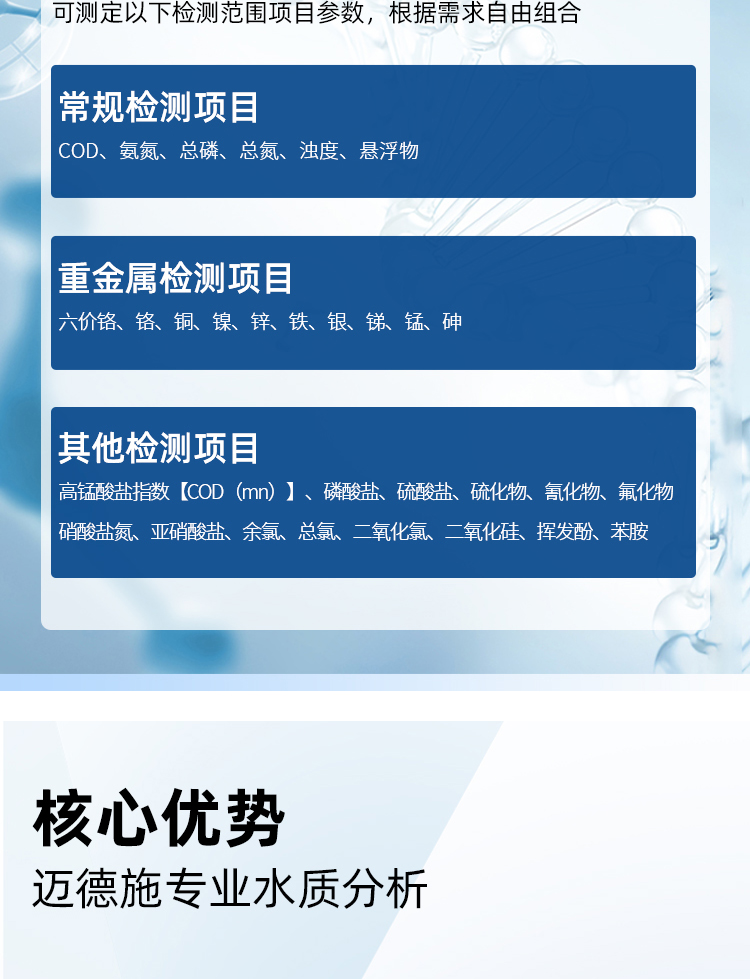 支持COD、氨氮、總磷、總氮、單離子、重金屬等30多項指標測定。