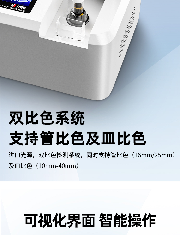 雙比色檢測系統(tǒng),同時支持管比色(16mm、25mm)及皿比色(10mm-40mm)。