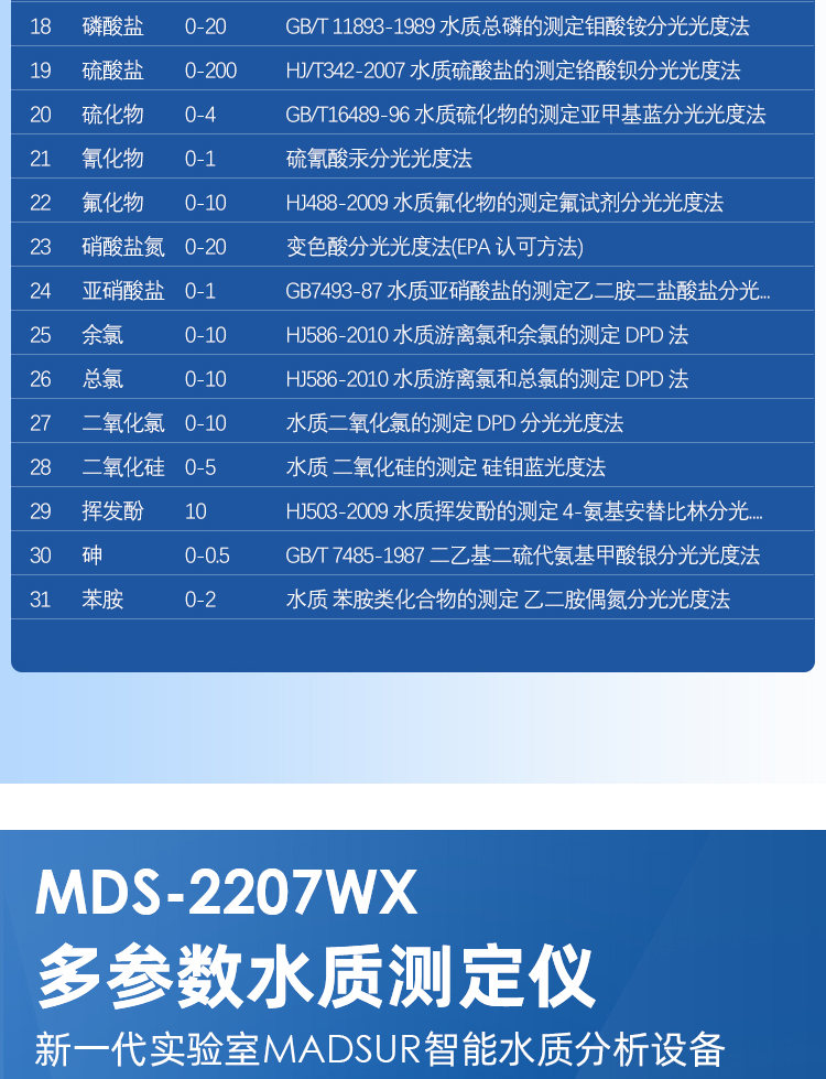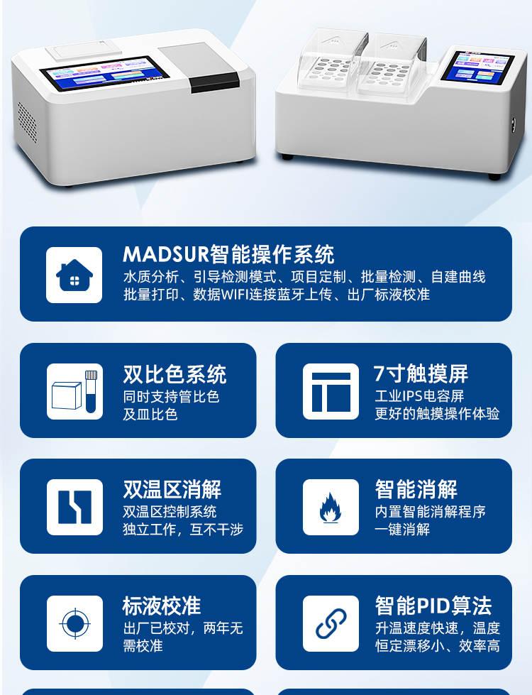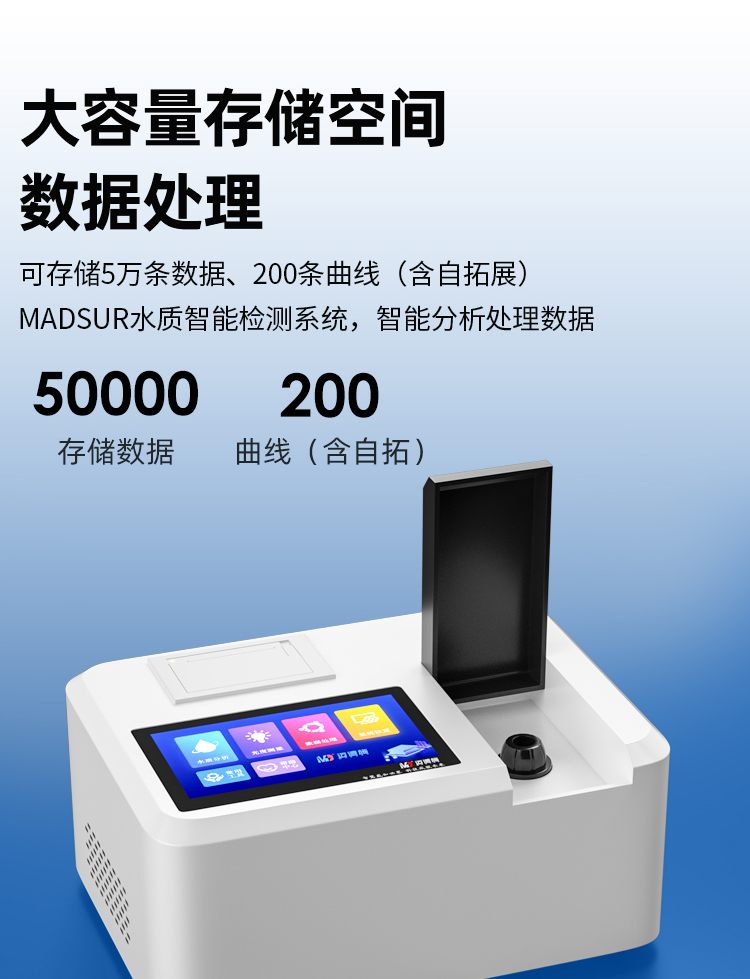 MDS -2207WX 型多參數(shù)水質快速測定儀,基于國家檢測標準(GB)及環(huán)境部檢測標準(HJ)研發(fā)生產。儀器采用工業(yè)級IPS7寸電容觸摸屏,數(shù)據(jù)直觀,操作方便;檢測裝置采用進口光學檢測比色系統(tǒng),并搭載我司自主研發(fā) MADSUR?水質智能檢測系統(tǒng);使得儀器的穩(wěn)定性、壽命、檢測精準度跨越性提高;MADSUR?水質智能檢測系統(tǒng)是基于國人操作習慣的理念開發(fā)而成,操作簡單快速;無 需專業(yè)人員即可輕松操作;真正做到:讓檢測更簡單!廣泛應用于企業(yè)污水檢測、環(huán)境監(jiān)測站、科研單位、高校、河流污染監(jiān)察等水質快檢領域。