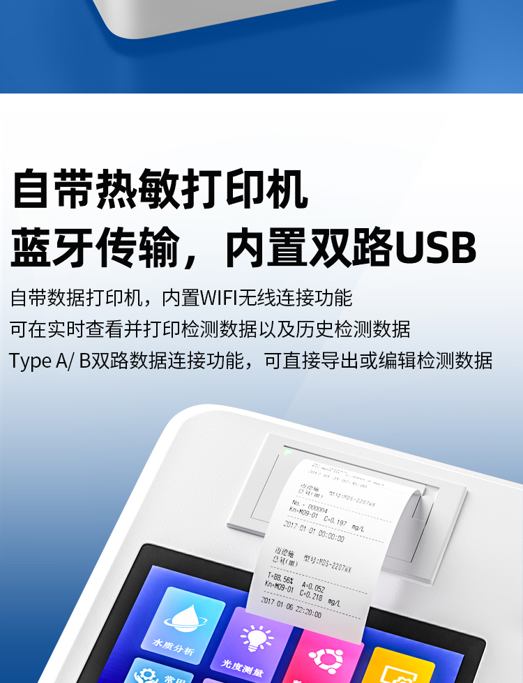 內置雙路USB(TypeA、TypeB)數(shù)據(jù)連接功能,可直接導出或編輯檢測數(shù)據(jù)。